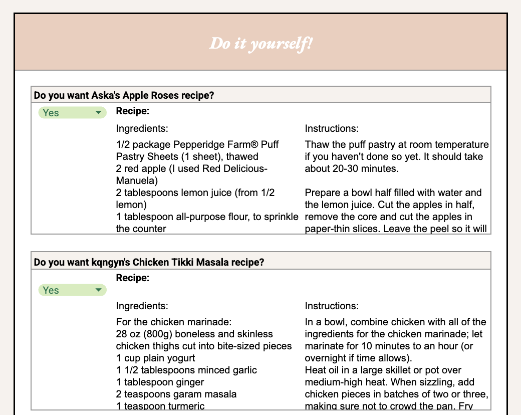 - "I go online and search for whatever I want to make. I don't really use recipes in detail, I just look at the general ingredients and steps and then go for it."